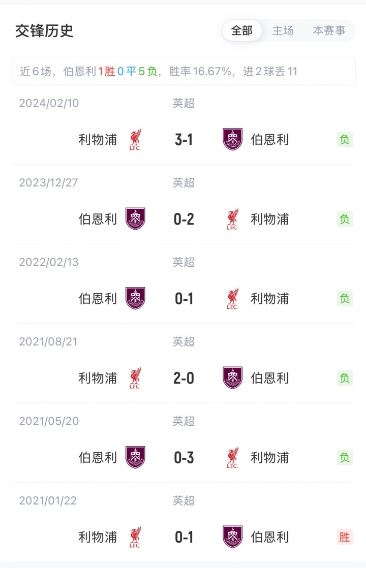 利物浦在客战对阵伯恩利的近9场英超赛事 中赢了8场,最近6场取得连胜。