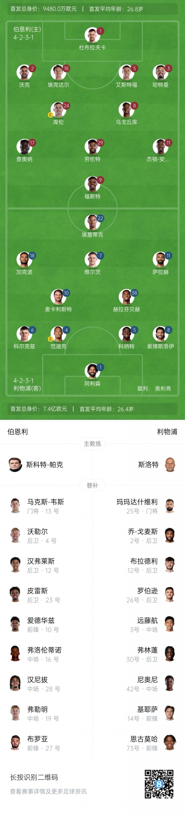 利物浦杆位:1-阿利森、4-范迪克、5-科纳特、6-科尔克兹、8-索博斯洛伊、38-赫拉芬贝赫、10-麦卡利斯特、7-维尔茨、18-加克波、11-萨拉赫、22-埃基蒂克