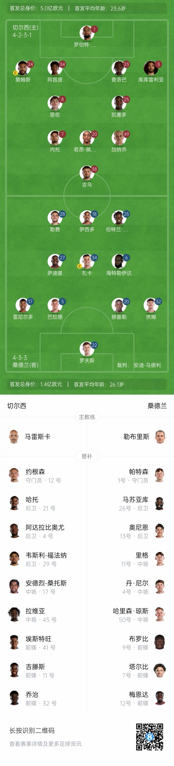 切尔西杆位:1-桑切斯、24-詹姆斯、34-乔什·阿昌庞、23-查洛巴、3-库库雷利亚、25-凯塞多、8-恩佐、7-内托、20-若昂·佩德罗、49-加纳乔、38-吉乌