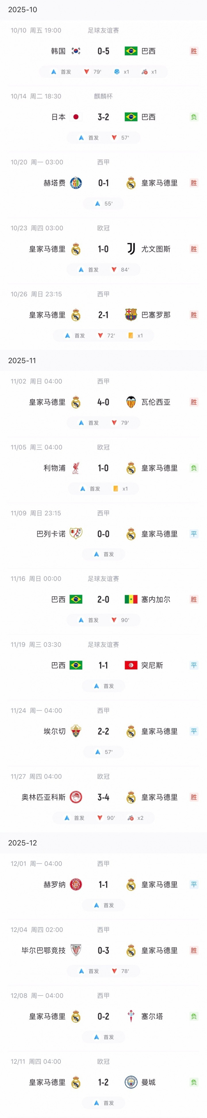 近15场各项赛事的赛事 中,维尼修斯几乎场场杆位,但只交出2记助功 ,同期还拿到2张警告 ,竞技状态 欠佳。