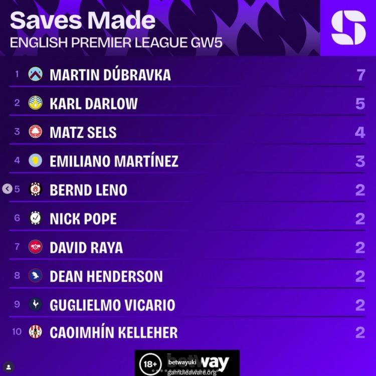 9月24日讯 英超第5轮战罢,squawkafootball列各项数据排行,苏超在线直播高清视频无插件伯恩利守门员杜布拉夫卡是本轮抢救 次数最多的守门员,共有7次。