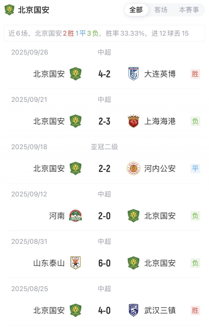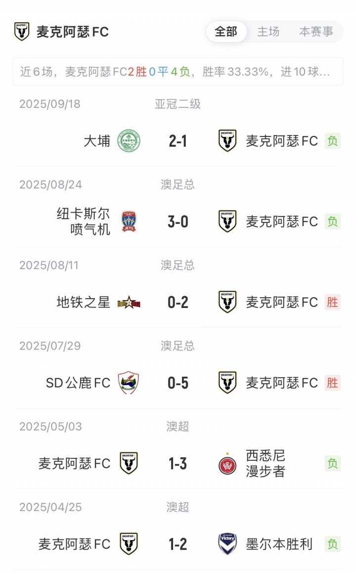 国安与麦克阿瑟此前还未交手过,双方近6场赛事 战绩如下: