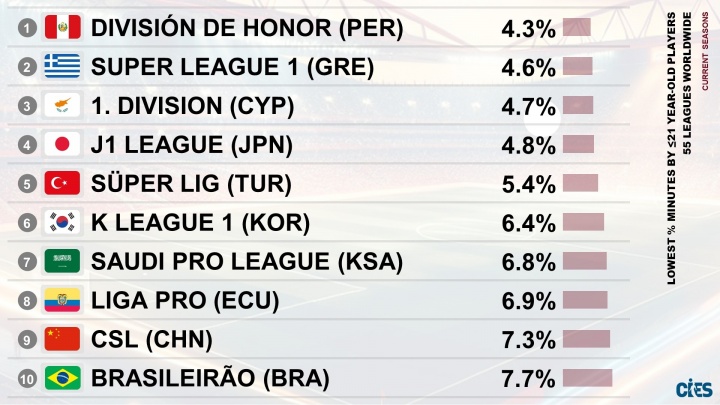 10月18日讯 近日,古代足球 权威统计机构CIES发布最新统计,全球55个职业联赛 中U21球员出场时间占比最少的职业联赛 ,秘鲁职业联赛 4.3%居首,J职业联赛 4.8%第4,K职业联赛 6.4%第6,中超7.3%第9。