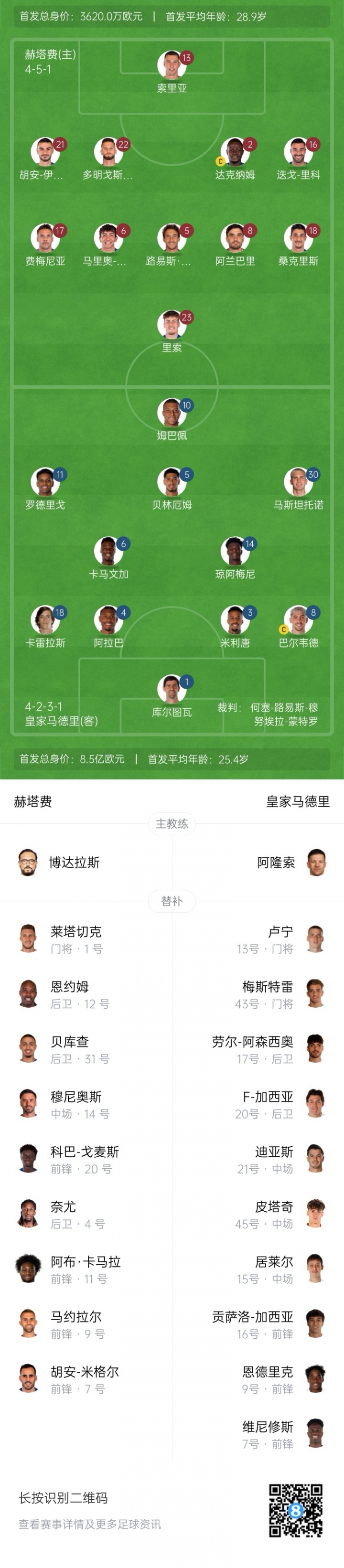 赫塔费后备 :1-莱塔切克、31-贝库查、12-恩约姆、4-奈尤、14-穆尼奥斯、7-胡安·米格尔、9-马约拉尔、11-阿布·卡马拉、20-科巴·戈麦斯