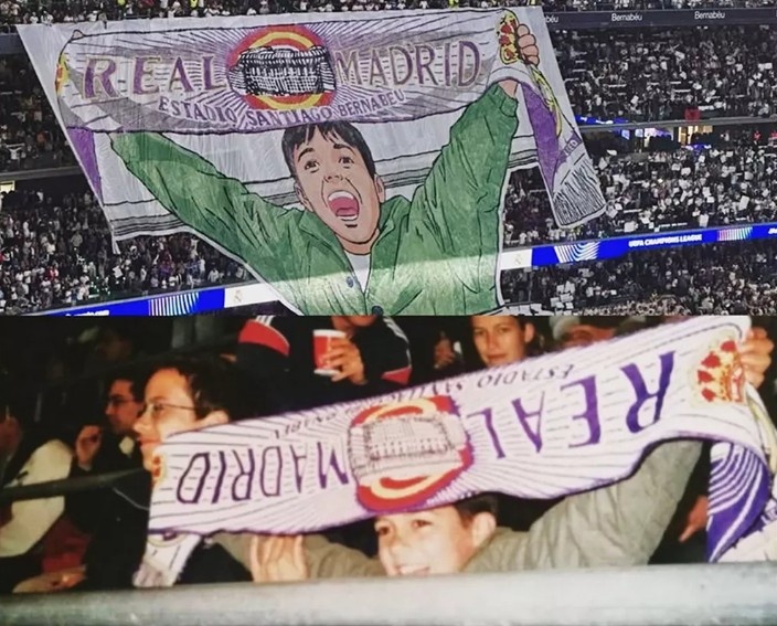 皇马主场作战 迎战尤文图斯时看台展示的致敬TIFO,灵感源自他幼时在伯纳乌的留影